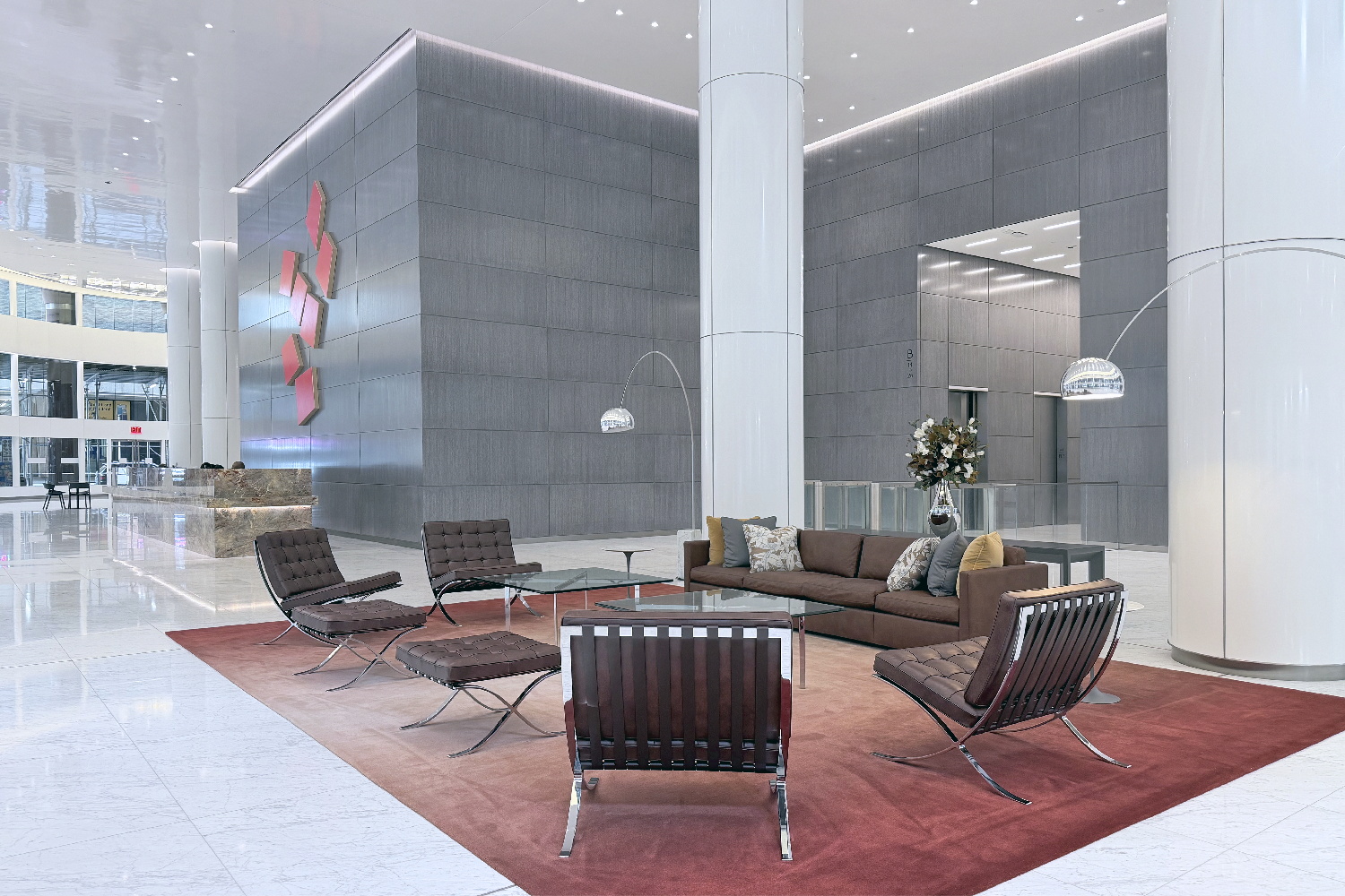 In early 2024, a newly redesigned lobby was revealed. Created by MdeAS Architects, the lobby now features white marble walls and a prominent reception desk positioned at the forefront beneath a striking sculpture by German Modernist artist Imi Knoebel. The renovation also introduced modern LED lighting in the ceiling, refurbished elevator interiors, and updated seating arrangements. Additionally, the restaurant located at the lobby’s northern end was replaced by an Epicerie Boulud cafe and an open seating area, enhancing the lobby’s iconic oval shape.